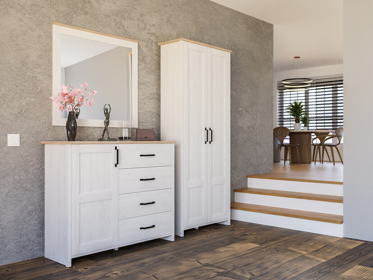 Se gosta da simplicidade do estilo escandinavo e das ideias interiores, então esta coleção é o que procura. A coleção de mobiliário espalha a simplicidade e o aconchego. A coleção é dominada por cores brilhantes e claras. As fachadas e armários brilhantes do mobiliário têm algumas sugestões de padrão de madeira, o que lhe confere naturalidade e combina bem com as bancadas. Esta coleção impressiona com a simplicidade das fachadas e os pequenos puxadores que servem de contraste. Com o mobiliário da coleção, é possível instalar uma sala de estar ou um espaço de corredor com aspecto estilizado. Não só acolhedor, mas também prático, o design acomodará as coisas mais importantes e assegurará que o uso de mobiliário seja o mais agradável possível. O mecanismo de fecho silencioso no mobiliário é especial na medida em que protege as portas e gavetas do fecho rápido. Graças a amortecedores especiais, as portas e gavetas são paradas imediatamente antes de fecharem e são puxadas lentamente, de modo a não fazerem qualquer barulho. O mobiliário terá um óptimo aspecto tanto em interiores claros como escuros e criará um ambiente de interiores escandinavos.