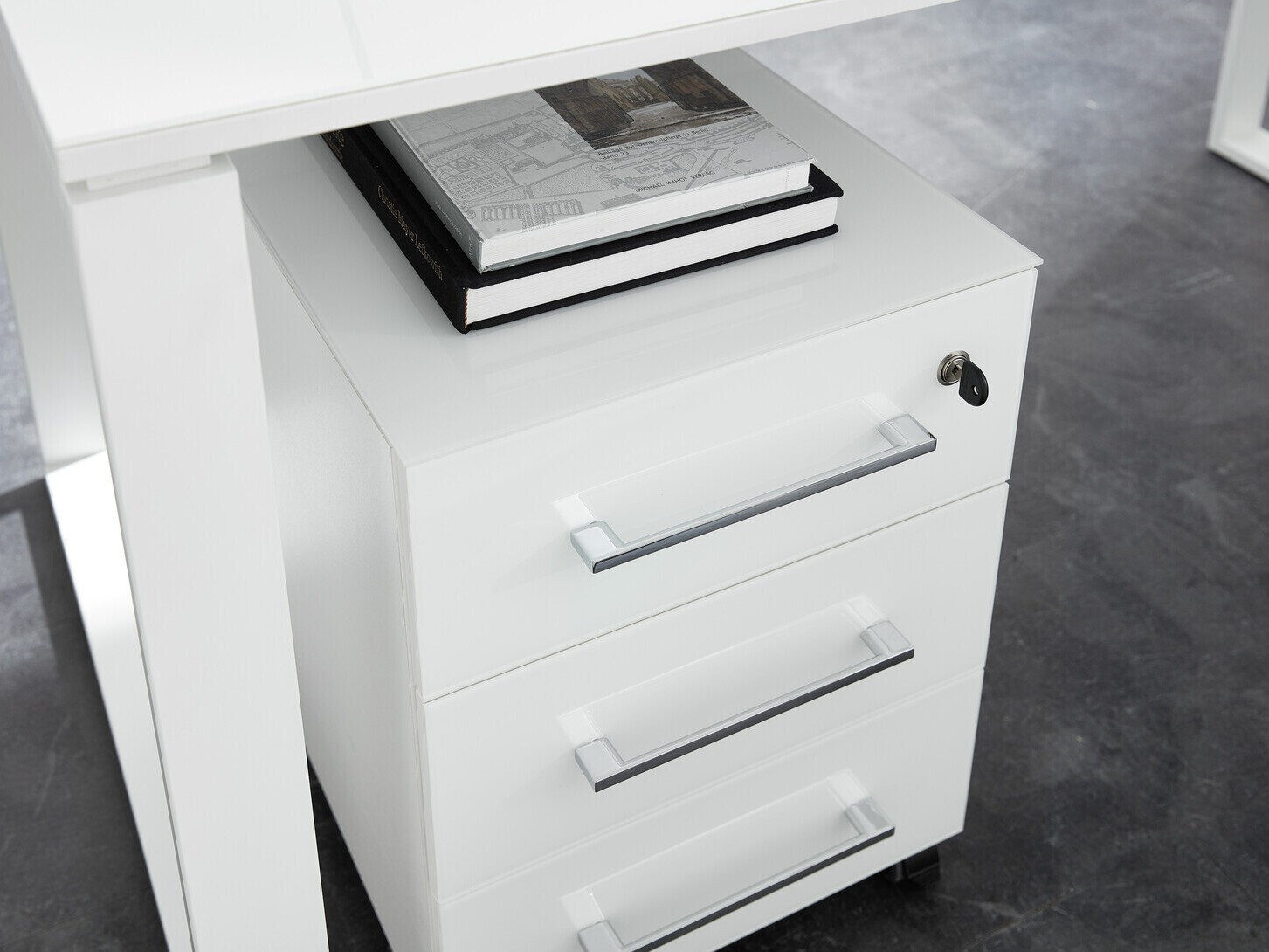 A coleção de mobiliário de trabalho incorpora um estilo de interior moderno. A cor branca dá elegância a esta coleção e a cor do carvalho "Navarra" dá-lhe naturalidade. Esta coleção é dominada por superfícies de vidro temperado complementadas por pegas cromadas. As molduras de mobiliário desta coleção são revestidas com um material incolor que as protege de pequenos arranhões. Com a ajuda deste material, o mobiliário torna-se não só resistente a riscos mas também melhor protegido da humidade ou manchas. Funcionalidade e comodidade são características integrantes desta coleção feita na Alemanha. Armários com um mecanismo de fecho silencioso protegem as portas e gavetas contra um fechamento rápido, e gavetas e portas com fechadura proporcionam privacidade. Crie um ambiente de trabalho moderno com esta coleção.