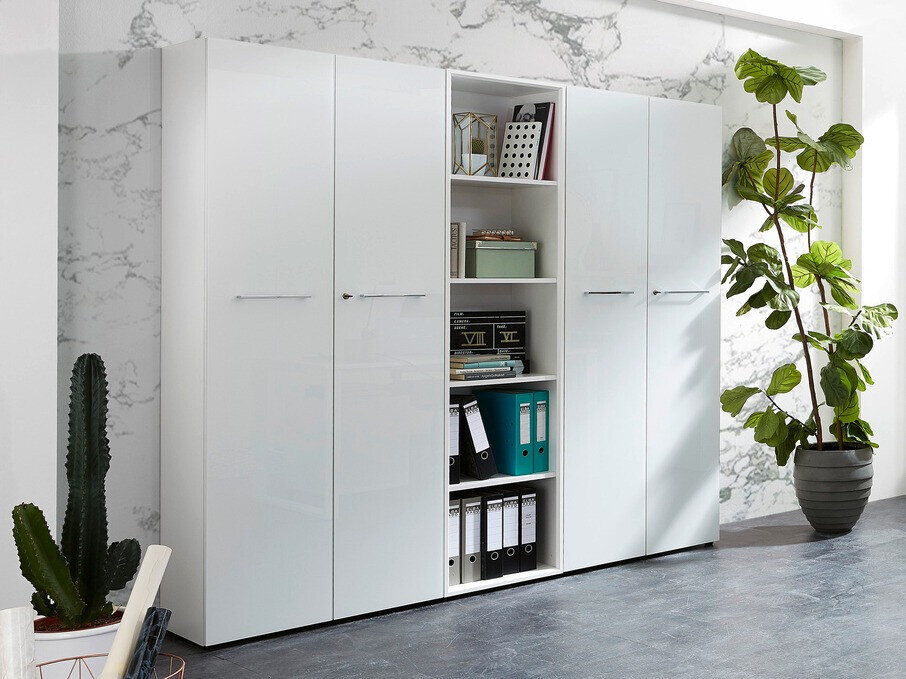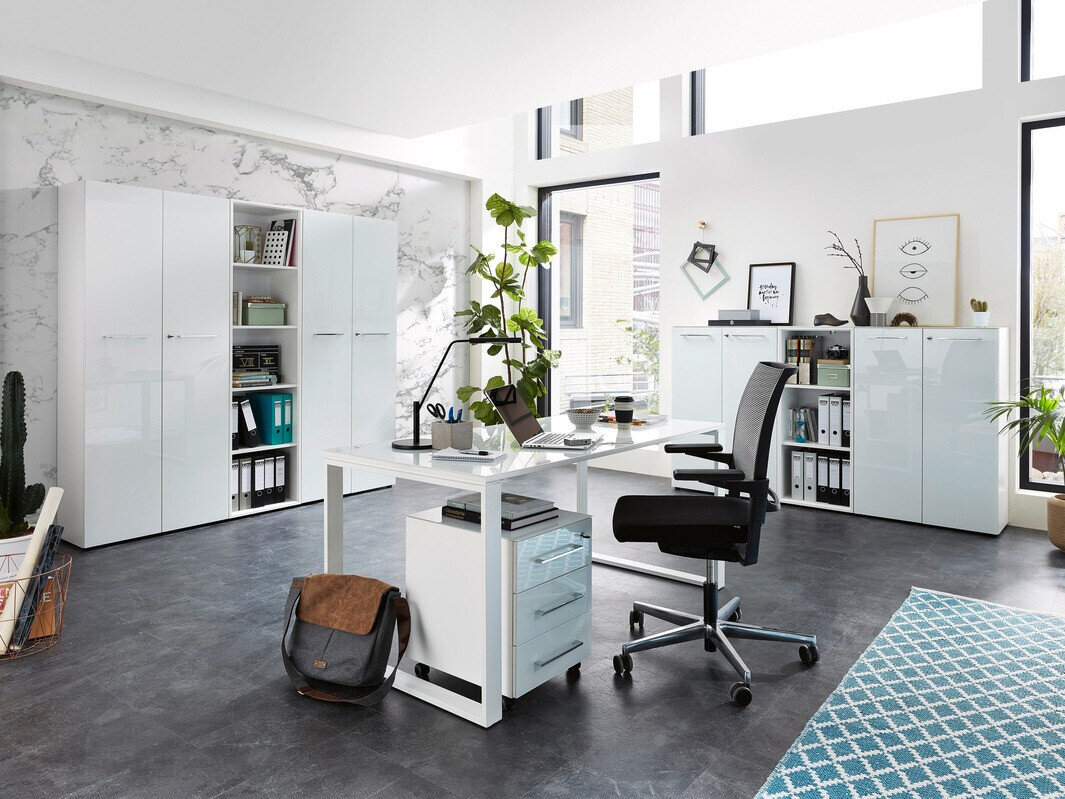A coleção de mobiliário de trabalho incorpora um estilo de interior moderno. A cor branca dá elegância a esta coleção e a cor do carvalho "Navarra" dá-lhe naturalidade. Esta coleção é dominada por superfícies de vidro temperado complementadas por pegas cromadas. As molduras de mobiliário desta coleção são revestidas com um material incolor que as protege de pequenos arranhões. Com a ajuda deste material, o mobiliário torna-se não só resistente a riscos mas também melhor protegido da humidade ou manchas. Funcionalidade e comodidade são características integrantes desta coleção feita na Alemanha. Armários com um mecanismo de fecho silencioso protegem as portas e gavetas contra um fechamento rápido, e gavetas e portas com fechadura proporcionam privacidade. Crie um ambiente de trabalho moderno com esta coleção.