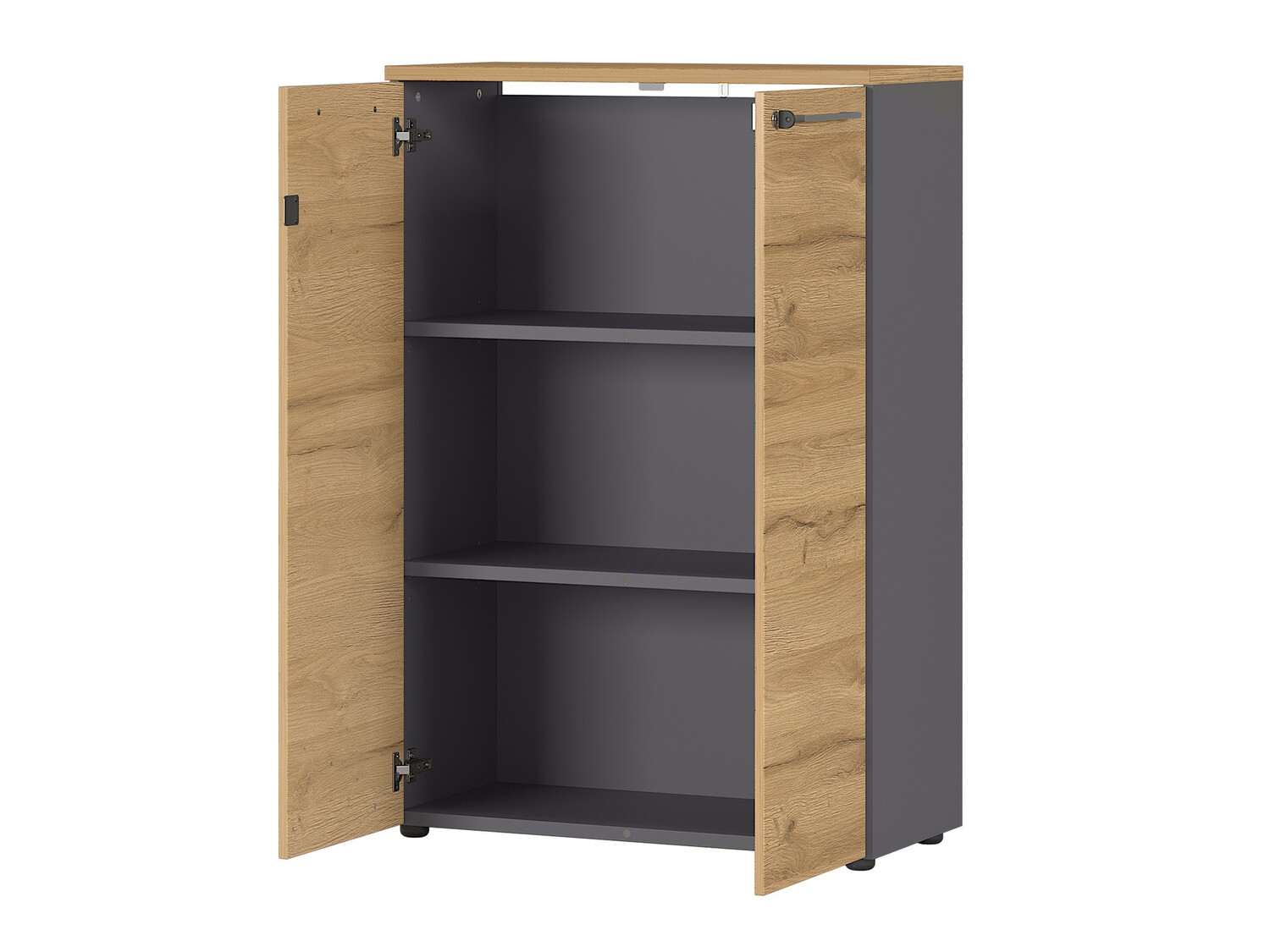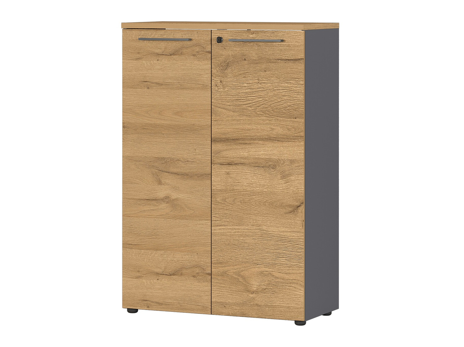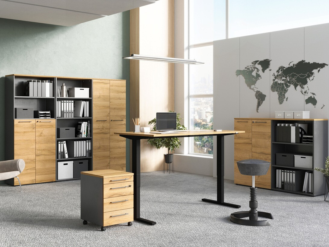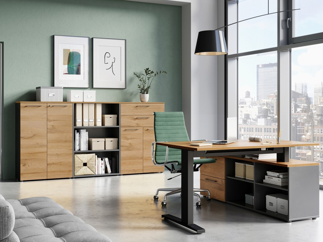 A coleção de mobiliário de design moderno irá encantar todos os fãs do design minimalista. Nesta coleção de mobiliário, pode escolher entre várias opções de cores. Mobiliário cinzento claro irá encantar aqueles que gostam de design de casa brilhante, mobiliário de carvalho "Grandson" complementado com cor grafite irá encantar os amantes da naturalidade. Esta coleção de mobiliário é complementada por pegas metálicas que dão leveza ao interior. O mobiliário é fácil de manter, uma vez que é coberto com um material incolor que o protege de pequenos arranhões e permite uma fácil limpeza da sujidade acumulada. Esta coleção tem também bordas protegidos com plástico, que são feitos de materiais resistentes ao impacto. As gavetas e portas têm um mecanismo de fecho silencioso, que é especial na medida em que as impede de fechar rapidamente. Funcionalidade e comodidade são características integrantes desta coleção feita na Alemanha. Os armários permitirão escolher a forma mais conveniente de guardar as coisas, uma gaveta com fechadura proporcionará privacidade, e uma mesa regulável em altura ajudará a criar um local de trabalho confortável. Esta coleção de móveis irá ajudá-lo a criar um ambiente de trabalho moderno.