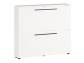 A coleção de corredores de design moderno irá encantar todos os amantes da modernidade. Esta coleção é complementada por longas pegas de metal preto que se encaixam perfeitamente no design do mobiliário. O mobiliário é fácil de manter, uma vez que é coberto com um material incolor que o protege de pequenos arranhões e permite limpar facilmente a sujidade acumulada. As bordas da coleção de mobiliário são cobertas com uma fita de acabamento, que é feita de plástico forte e protege o mobiliário de pequenos danos. As gavetas e portas têm um mecanismo de fecho silencioso, que é especial na medida em que as protege de um fechamento rápido. Os armários estreitos encaixam perfeitamente no design da sua casa, e os suportes metálicos de calçado que neles se encontram asseguram uma confortável arrumação de sapatos. Funcionalidade e comodidade são características integrantes desta coleção feita na Alemanha. Crie um ambiente moderno com esta coleção de mobiliário.