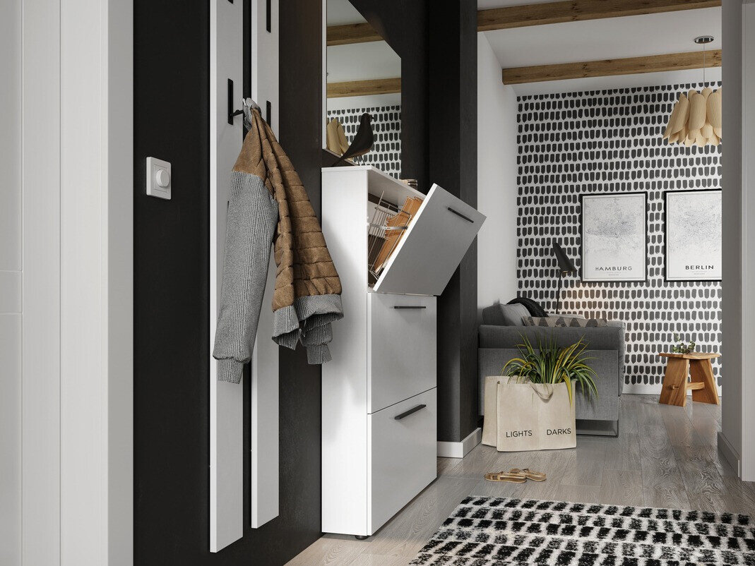 A coleção de corredores de design moderno irá encantar todos os amantes da modernidade. Esta coleção é complementada por longas pegas de metal preto que se encaixam perfeitamente no design do mobiliário. O mobiliário é fácil de manter, uma vez que é coberto com um material incolor que o protege de pequenos arranhões e permite limpar facilmente a sujidade acumulada. As bordas da coleção de mobiliário são cobertas com uma fita de acabamento, que é feita de plástico forte e protege o mobiliário de pequenos danos. As gavetas e portas têm um mecanismo de fecho silencioso, que é especial na medida em que as protege de um fechamento rápido. Os armários estreitos encaixam perfeitamente no design da sua casa, e os suportes metálicos de calçado que neles se encontram asseguram uma confortável arrumação de sapatos. Funcionalidade e comodidade são características integrantes desta coleção feita na Alemanha. Crie um ambiente moderno com esta coleção de mobiliário.