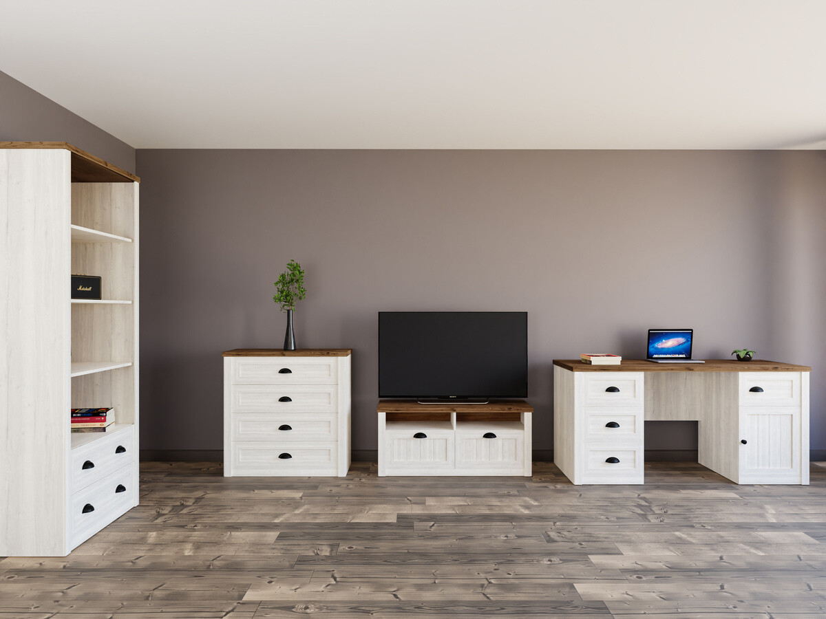 Para aqueles que querem criar uma sala de estar e um quarto aconchegante, esta coleção com um design intemporal será uma grande escolha. Trazê-lo-á de volta à simplicidade e ao ritmo lento da vida. É importante manter o equilíbrio tanto no quarto de dormir como na sala de estar. As cores afectam directamente o nosso estado emocional, por isso, ao escolher o mobiliário, preste atenção ao que a cor irá dominar no interior. As fachadas de mobiliário desta coleção têm sugestões de padrões de madeira que acrescentam aconchego ao mobiliário. As pegas metálicas tornam-se o acento de toda a coleção. As pegas em forma de meia lua acrescentam um carácter extra ao design. O design aconchegante permitir-lhe-á desfrutar também da funcionalidade do mobiliário: o mobiliário tem muitas prateleiras e gavetas espaçosas. Estas peças de mobiliário cuidarão de todas as pequenas coisas e ajudá-lo-ão facilmente a manter a ordem.