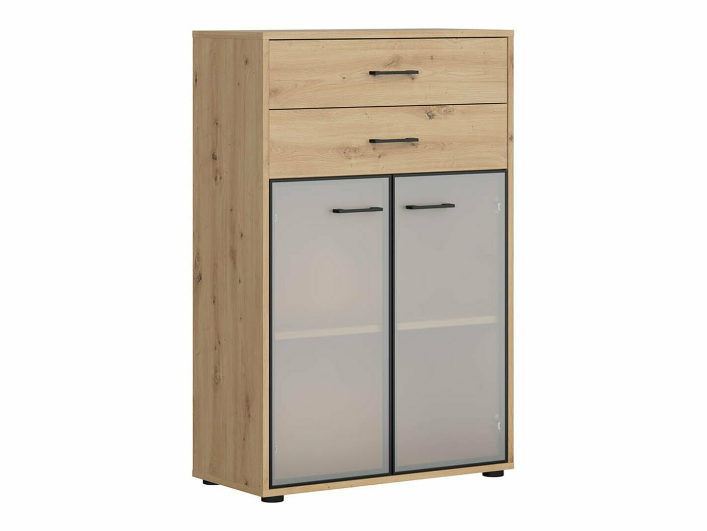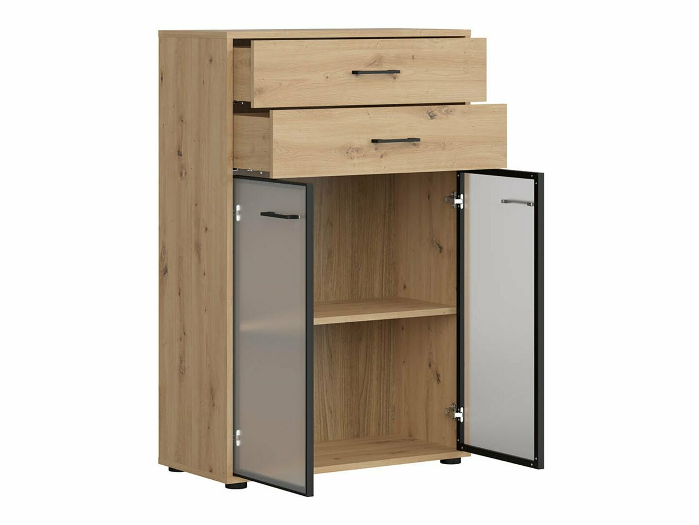 Se procura mobiliário para um escritório funcional - esta coleção é destinada a si. A combinação de carvalho "Artisan" e cor preta acrescenta modernidade ao mobiliário. As pegas de plástico preto minimalista misturam-se perfeitamente com o design. O mobiliário da coleção é feito de aglomerado laminado com uma superfície resistente a riscos. Com esta película protectora, o mobiliário torna-se resistente não só a riscos, mas também melhor protegido da humidade ou manchas. O mecanismo de fecho silencioso incorporado no mobiliário irá melhorar ainda mais a experiência do utilizador e assegurar a abertura e fecho silencioso de portas e gavetas. O mobiliário tem tanto áreas de armazenamento abertas como fechadas. Isto permite que os objectos pessoais sejam guardados em prateleiras visíveis ou escondidos atrás de portas. A coleção utiliza vidro fosco temperado e tratado termicamente. A sua resistência é 5-6 vezes superior à do vidro comum, termicamente não tratado. O vidro é moldado por uma moldura de alumínio preto. As prateleiras da coleção são universais. Durante a sua montagem, é possível decidir de que forma a porta se abrirá. As gavetas utilizam rodízios em vez de pernas, o que tornará extremamente fácil e conveniente a movimentação de mobiliário na sala. Além disso, as prateleiras com fechadura permitirão guardar objectos pessoais com ainda mais segurança. A base das secretárias da coleção é feita de uma moldura de metal preto que proporciona estabilidade. Para aqueles que procuram uma secretária funcional, a coleção oferece secretárias com um mecanismo eléctrico de ajuste de altura. Com a ajuda de alguns botões, a altura da mesa mudará, para que possa fazer o seu trabalho de forma ainda mais confortável e ergonómica. Com mobiliário funcional e universal, a criação de um espaço de escritório será um prazer.