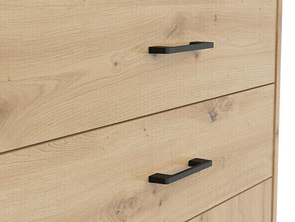 A combinação de carvalho "Artisan" e cor preta acrescenta modernidade ao mobiliário. As pegas de plástico preto minimalista misturam-se perfeitamente com o design. O mobiliário da coleção é feito de aglomerado laminado com uma superfície resistente a riscos. Com esta película protectora, o mobiliário torna-se resistente não só a riscos, mas também melhor protegido da humidade ou manchas. O mecanismo de fecho silencioso incorporado no mobiliário irá melhorar ainda mais a experiência do utilizador e assegurar a abertura e fecho silencioso de portas e gavetas.