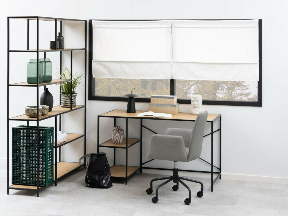 Escolhi porque queria uma prateleira leve no quarto. Não é colocado contra a parede, mas sim no meio da sala, criando uma espécie de divisão. Pode ser abordado por ambos os lados. É aberto e você vê muito através dele. Parece arejado e não pesado, não há sensação de entupimento no ambiente.