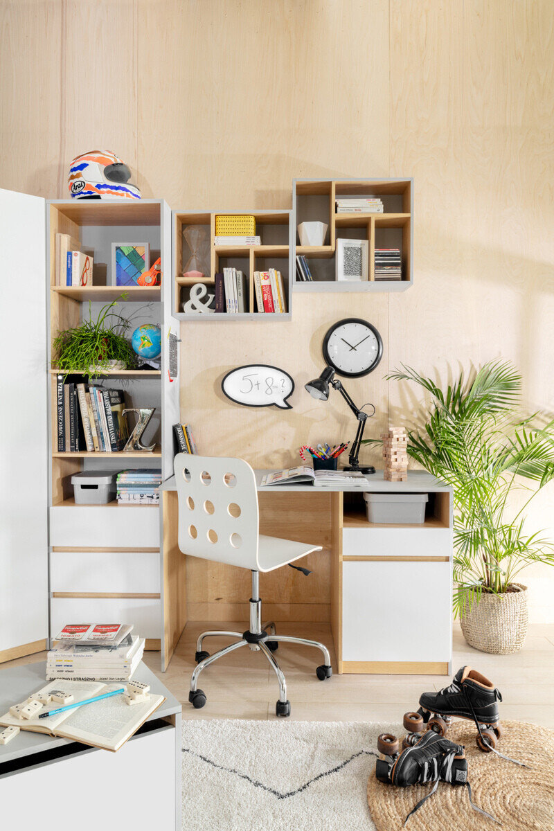No quarto de uma criança ou de um jovem, é importante manter um equilíbrio entre o design e a funcionalidade. Neste espaço, pode exprimir mais a sua imaginação, sem ter medo de cores brilhantes ou outros elementos de design. A inovação e a criatividade andam juntas na coleção. O mobiliário da coleção tem formas claras, cinza claro, carvalho e cores brancas brilhantes. O mobiliário combina cores neutras e elementos coloridos que complementam o design como um acento e se misturam perfeitamente em toda a vista. Não esquecendo as pessoas que não são grandes amantes de elementos brilhantes - também encontrará mobiliário em cores neutras na coleção. A flexibilidade será proporcionada por mobiliário espaçoso com secções abertas e fechadas. As superfícies do mobiliário são cobertas com um material incolor que protege contra pequenos arranhões. Há também um mecanismo de fecho silencioso integrado nas portas e gavetas, o que proporcionará conforto adicional durante a utilização do mobiliário. A coleção de mobiliário ajudará a criar facilmente um interior moderno e funcional para uma pessoa jovem.