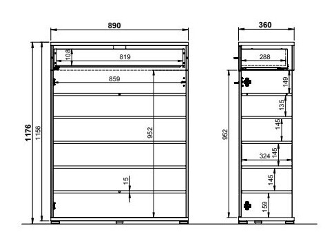 Informações sobre a fixação na parede. Para os móveis de parede ou suspensos não são fornecidas ferragens de fixação, pelo que deverá tratar da questão individualmente. Diferentes tipos de paredes requerem parafusos específicos ou mesmo diferentes profundidades de perfuração. Selecione o material de montagem com base no peso do móvel e no tipo de parede (por exemplo, gesso cartonado, alvenaria, madeira, etc.). Para garantir a qualidade e a segurança, utilize parafusos concebidos especificamente para o seu tipo de parede.