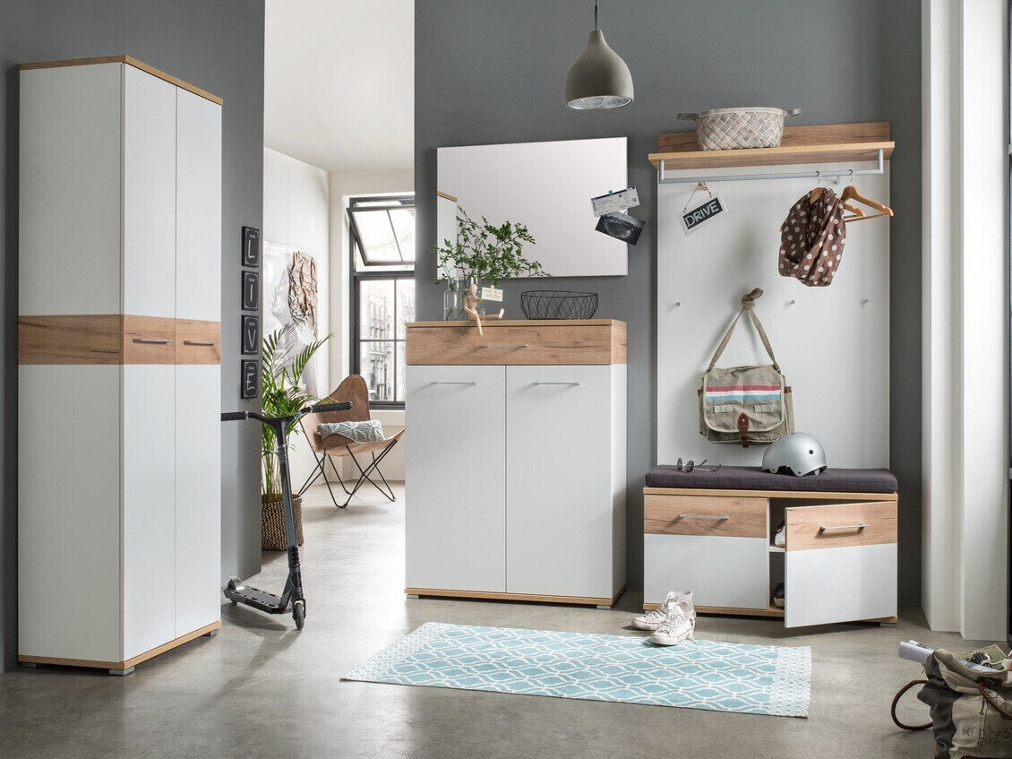 A coleção de mobiliário que irá ajudar a criar um interior moderno em casa. O mobiliário desta coleção é complementado por pegas de metal, de design minimalista, que se misturam perfeitamente no design do mobiliário. É possível escolher entre várias cores no mobiliário da coleção. O branco mate pode ser combinado com várias cores: carvalho "Navarra" e cinzento concreto. O mobiliário é fácil de manter, pois é coberto com um material incolor que o protege de pequenos arranhões e lhe permite limpar facilmente a sujidade acumulada. As bordas dos móveis revestidos de plástico são resistentes a danos causados pelo uso diário. As gavetas e portas têm um mecanismo de fecho silencioso, que é especial na medida em que os impede de fechar rapidamente. Funcionalidade e comodidade são características integrantes desta coleção feita na Alemanha. Crie um ambiente doméstico harmonioso com esta coleção de mobiliário.