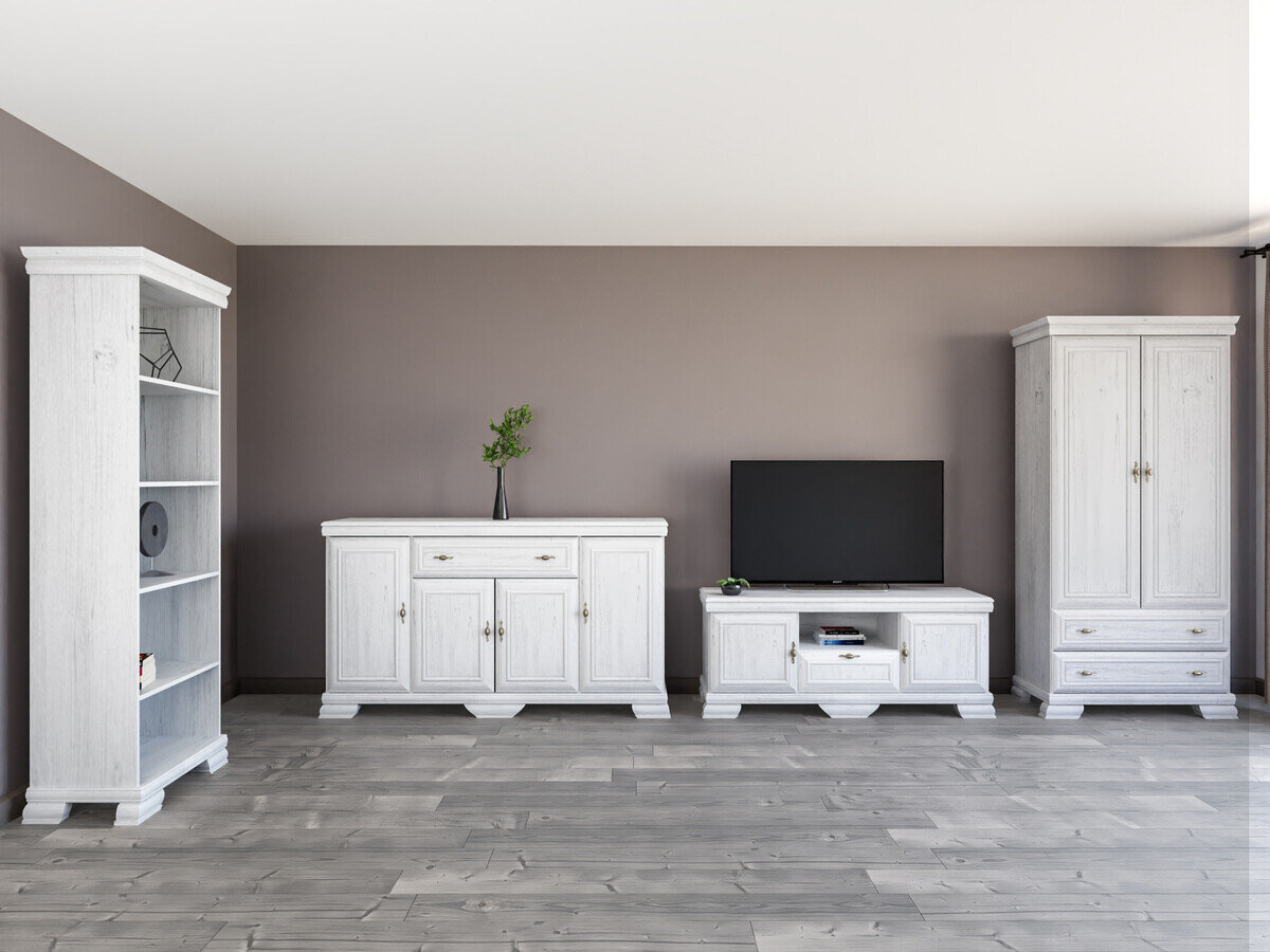 Esta coleção de estilo clássico é para aqueles que valorizam o design e a elegância intemporais. Os móveis da coleção são decorados com puxadores de metal de design exclusivo, dando a cada peça um toque de luxo. Uma das características mais importantes desta coleção é a sua superfície resistente a riscos, que garante a durabilidade do mobiliário. Mesmo após muitos anos de utilização contínua, este mobiliário manterá o seu aspeto impecável. Esta coleção não só irradia elegância, como também dá prioridade à funcionalidade. As prateleiras e as gavetas são espaçosas, garantindo que terá espaço suficiente para manter as coisas organizadas. A combinação do estilo clássico e do carácter prático garante que esta coleção não só decorará o seu interior, como também melhorará a qualidade da sua vida quotidiana. Desfrute da beleza do estilo clássico e traga uma elegância intemporal para a sua casa.