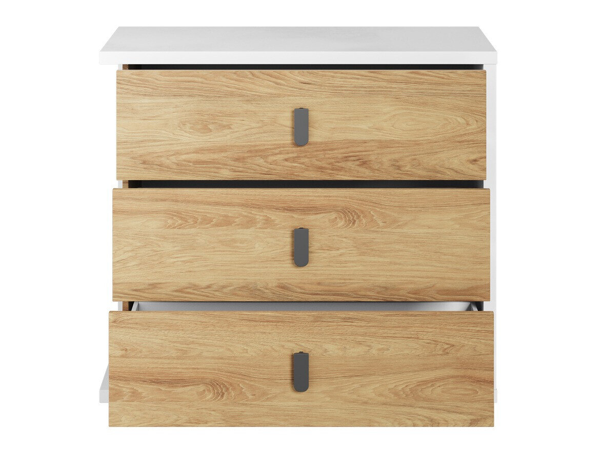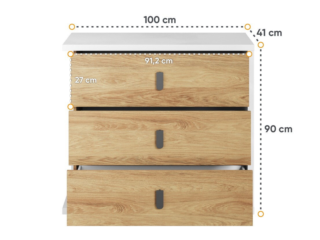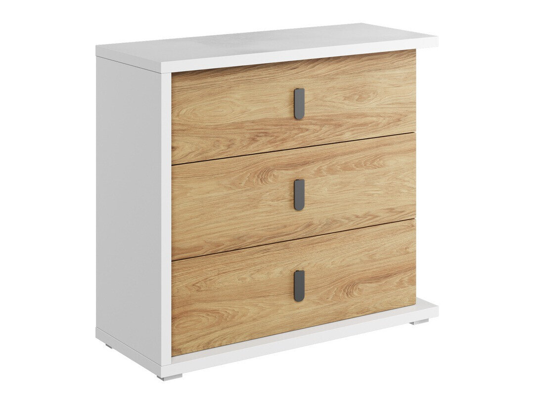 O mobiliário da coleção impressiona com a sua paleta de cores brilhantes e design simples. A cor branca e o carvalho quente são combinados aqui. Esta combinação de cores e simplicidade de linhas faz lembrar o estilo interior escandinavo, complementado por detalhes interiores modernos. A grande moldura de mobiliário branco confere ao mobiliário a sua singularidade. As fachadas utilizam pequenos puxadores de plástico que se misturam perfeitamente com todo o design. O espaço no mobiliário é totalmente utilizado: uma mesa com um tampo de mesa grande, gavetas espaçosas, prateleiras com muitos compartimentos, o que facilitará manter a ordem. Crie o quarto dos sonhos de um jovem a partir de mobiliário individual ou escolhendo um conjunto de móveis onde o mobiliário já esteja combinado.