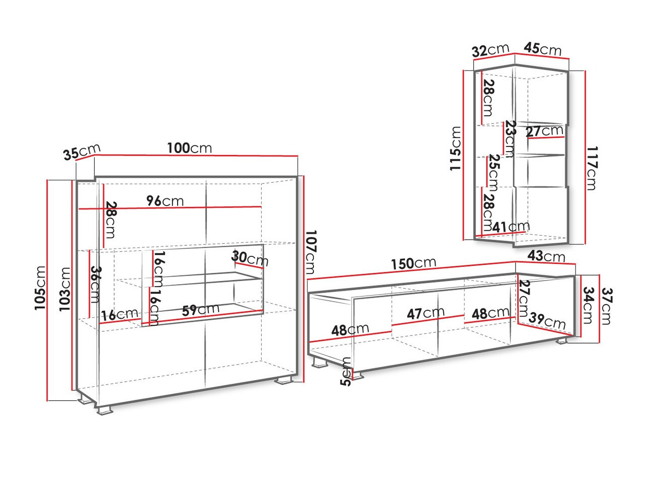 O conjunto de móveis é quase perfeito. Estou satisfeito com isso. Basta prestar atenção à cómoda de 2 portas. Em qualquer caso, deve ser fixado à parede, pois o seu peso derrubará o próprio armário ao abrir a porta. Como uma parte do conjunto pode ser montada na parede, o pacote pode incluir buchas e parafusos. Também pode ser conectado à iluminação, pois existem 2 fontes de luz LED separadas, 2 fontes de alimentação separadas e um botão. Esta também poderia ser uma versão com 1 adaptador, distribuidor e 1 botão, pois assim há muitos fios e é necessário pressionar 2 botões separadamente para iluminação. De qualquer forma, o conjunto é muito bom. 4 estrelas!