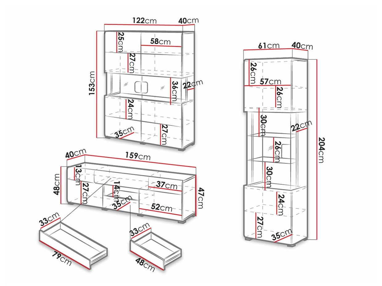 A coleção inclui armários de vários tamanhos, cómodas espaçosas, uma prateleira e uma mesa de centro. O acabamento brilhante da mobília ampliará visualmente o ambiente. As portas e gavetas da cómoda podem ser abertas com apenas um clique - uma comodidade garantida pelo mecanismo integrado "Push to open".