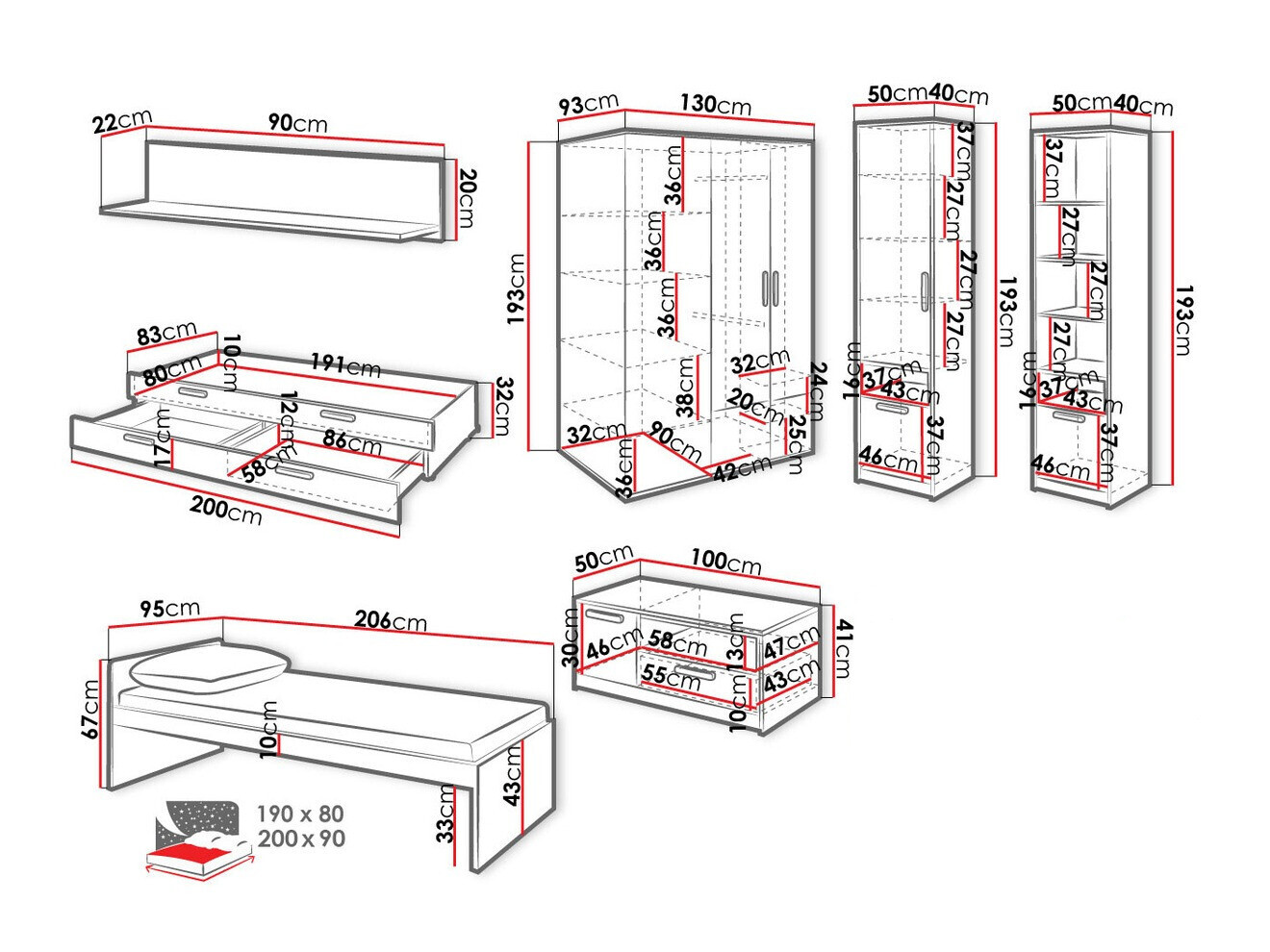- 90 x 200 cm