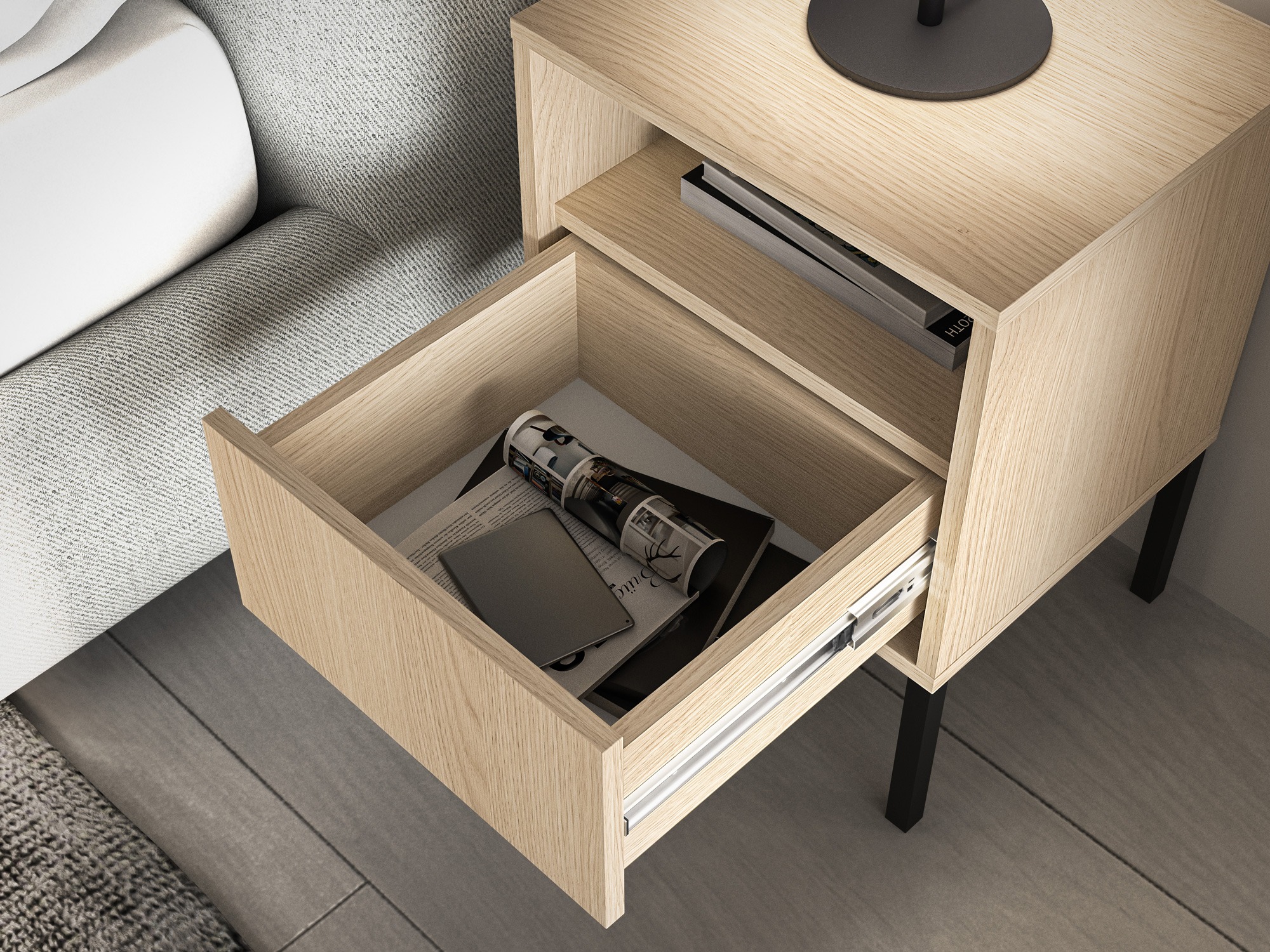 Abra portas e gavetas com apenas um toque. O sistema "Push to open" consiste na combinação de uma mola e um mecanismo magnético para pressionar e segurar a porta. Tem dobradiças com molas de compressão especiais para abrir a porta. Graças a este mecanismo, o móvel não requer puxadores. Pode abrir e fechar portas e gavetas com um clique.