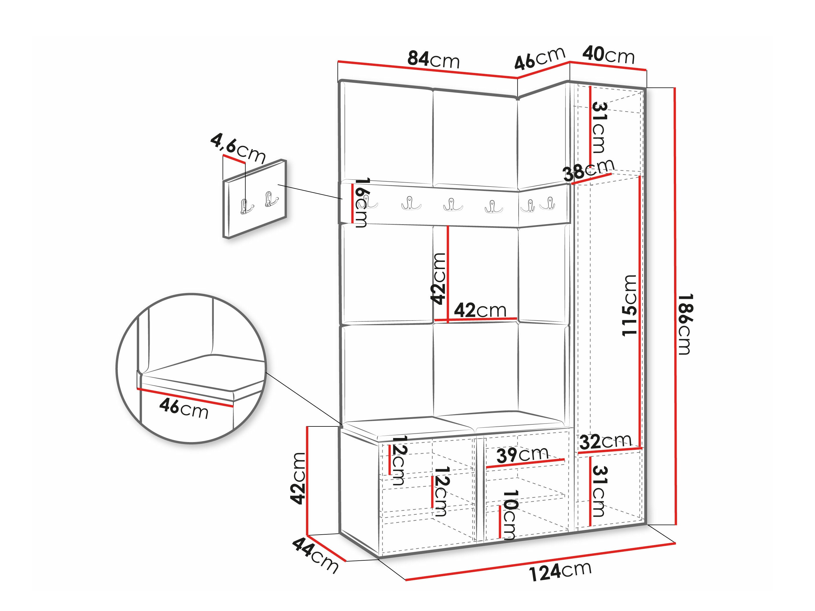 A mobília do hall parece boa e parece ser de qualidade. Fizemos uma pequena mudança, colocamos o cabide em cima dos painéis, e não entre eles, para que fique mais espaço para jaquetas e casacos. A única desvantagem seria o preço muito alto, visto que não há compensado atrás dos painéis estofados, eles são colados diretamente na parede e não há adesivo, devem ser adquiridos separadamente