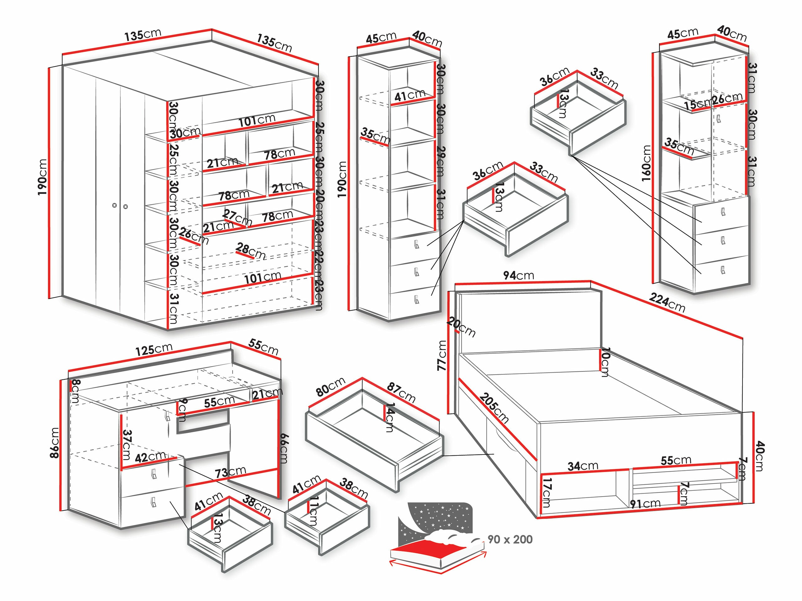 190 x 45 x 40; 160 x 45 x 40 cm