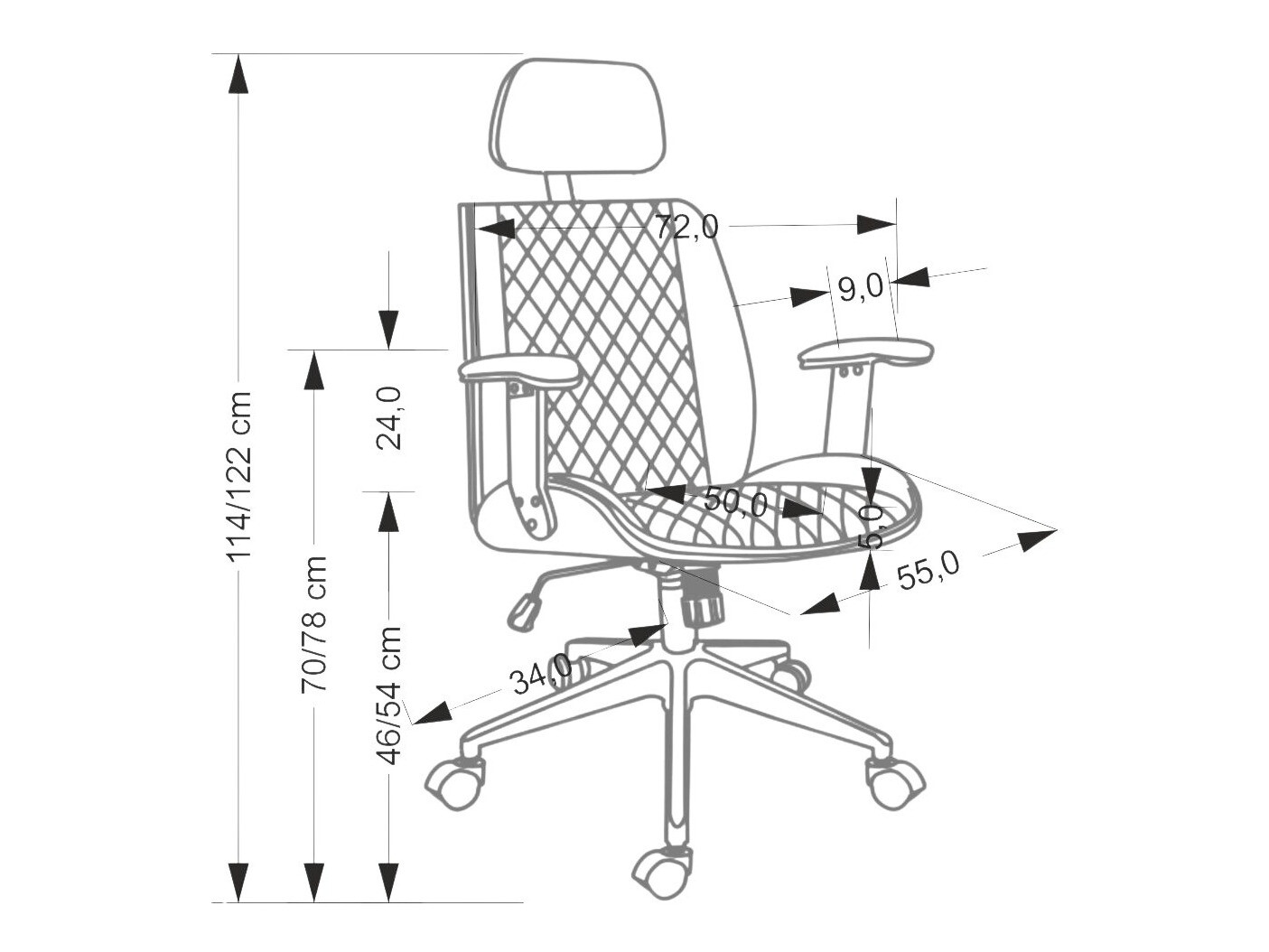Largura do apoio para braços:
